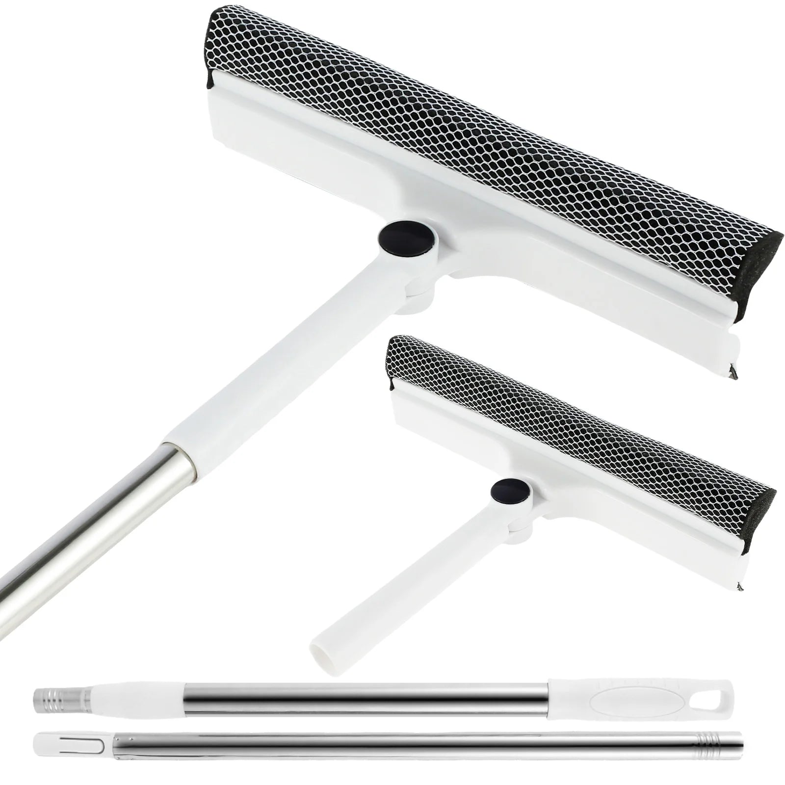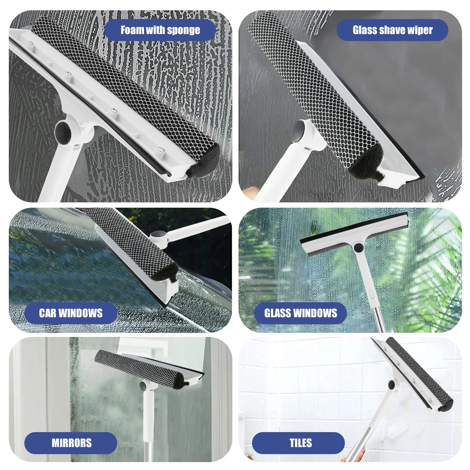 [Heavy Duty & Durable Materials] The window cleaning tools consist of sturdy high-quality stainless steel pole, durable plastic brush head, rubber wiper strips and quality sponge wiper, no noise, no scratches. It can better clean the dirt on the Windows without damaging the glass surface. The splicing and retractable handle design can effectively scrub and scrape the dirt on the high and low glass windows.