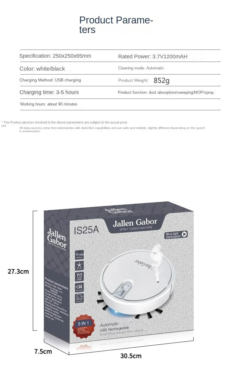 3. Five in one. Automatic sweeping, mopping, vacuuming, spraying, with LED ambient light. Detachable cleaning mop for deep and thorough cleaning. Easy to use and clean. All-in-one unit, perfect for large rooms, for all your cleaning needs. Less dust and more humid air. Very convenient and easy to use.