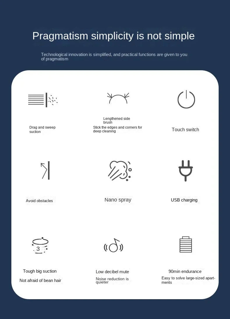 1. High efficiency. This USB automatic vacuum with longer brushes on both sides captures dust, debris, pet hair and grime. Wet/dry use. Better cleaning path design shortens cleaning time and improves efficiency.