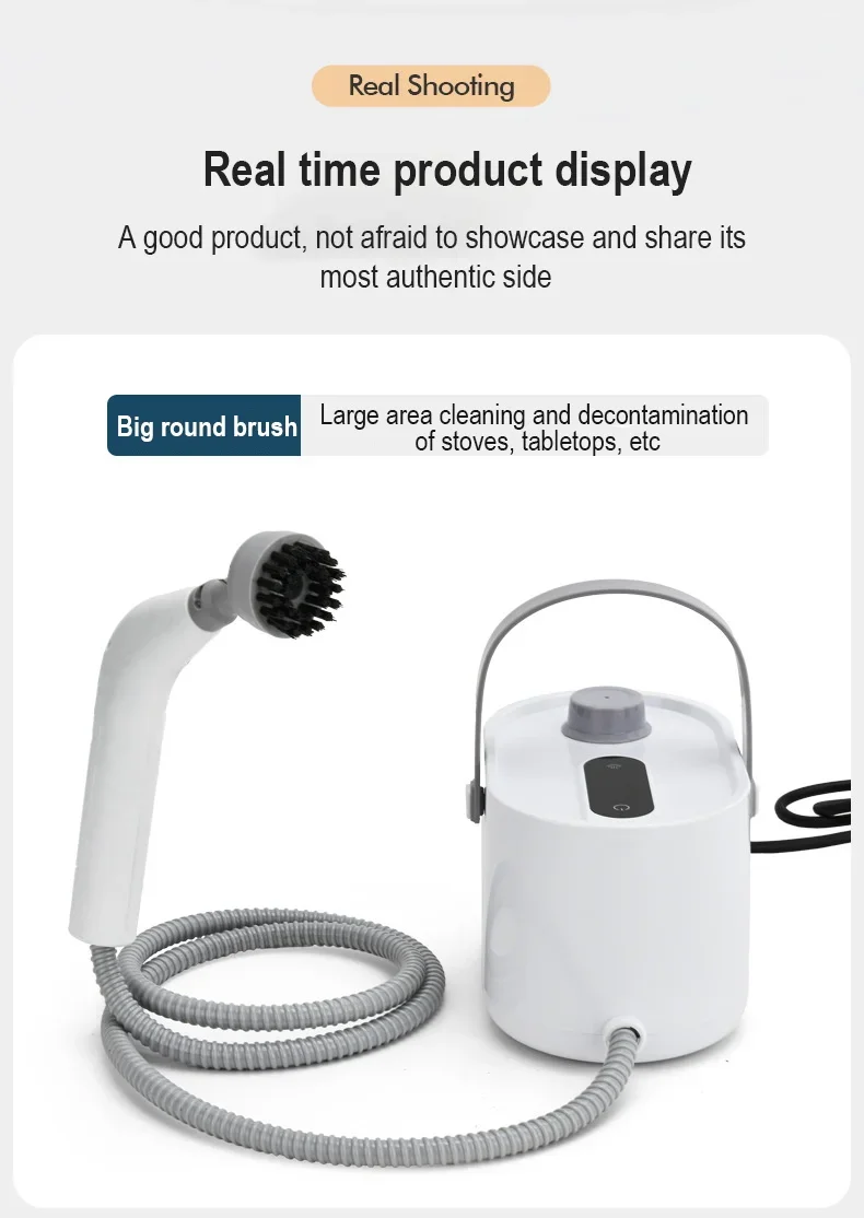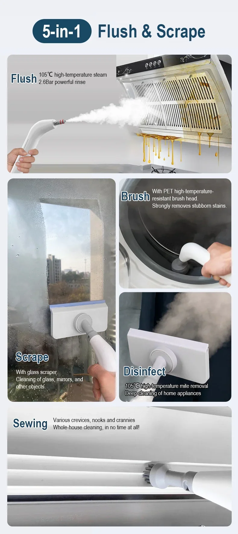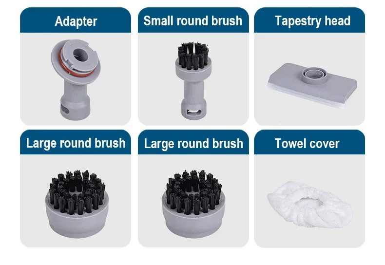 It is equipped with a flat-tipped nozzle (concentrated steam), a round nylon brush (hard surface), and a soft-bristled brush (fine material) as standard, making it easy to switch between different materials such as floors, windows, fabrics, and tires.